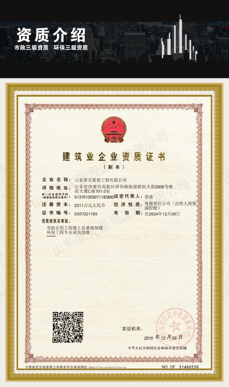 2019年12月9日,我公司正式获得市政公用工程施工总承包三级资质和环保工程专业承包三级资质。这是我公司坚持以诚信为先导,以创新为动力,以服务为理念所取得的一项重大发展成果。该项成果的取得,不仅是我公司长期坚持创新服务理念的有力诠释,同时也为我公司未来的发展奠定了基础。