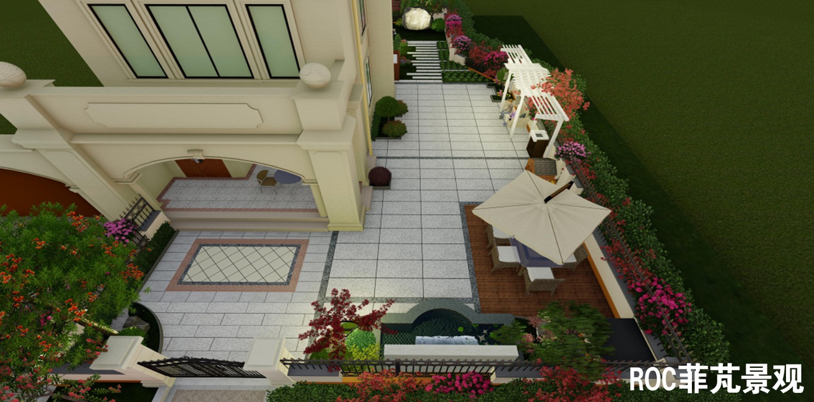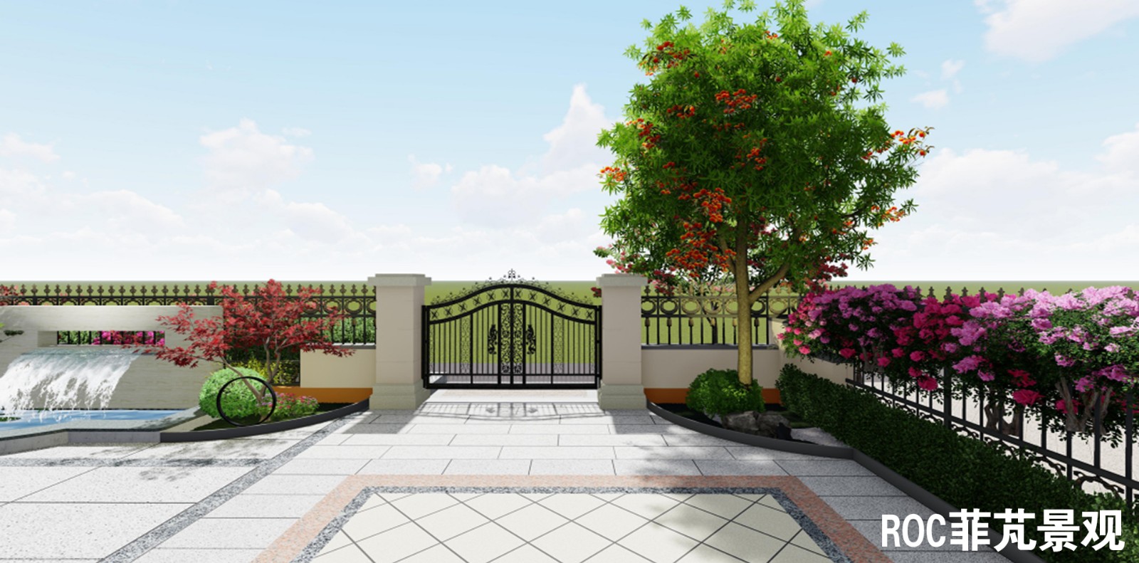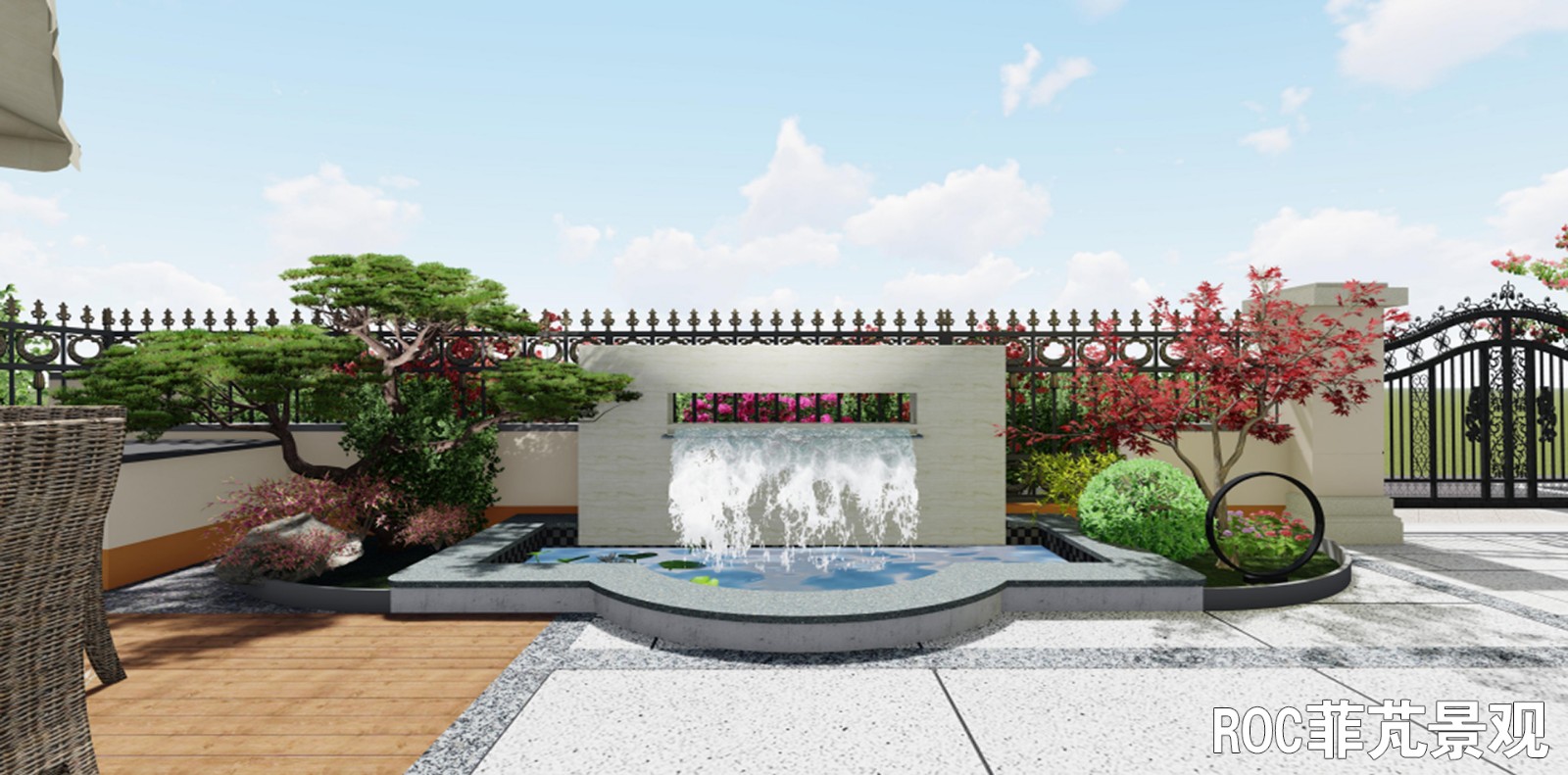 整个庭院以轴线设计,主要分为入口区、休闲区、生活区及儿童乐园。入口两侧分别栽种了柿子树和红枫,取意事事如意、鸿运当头。