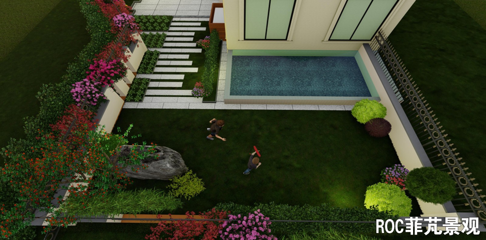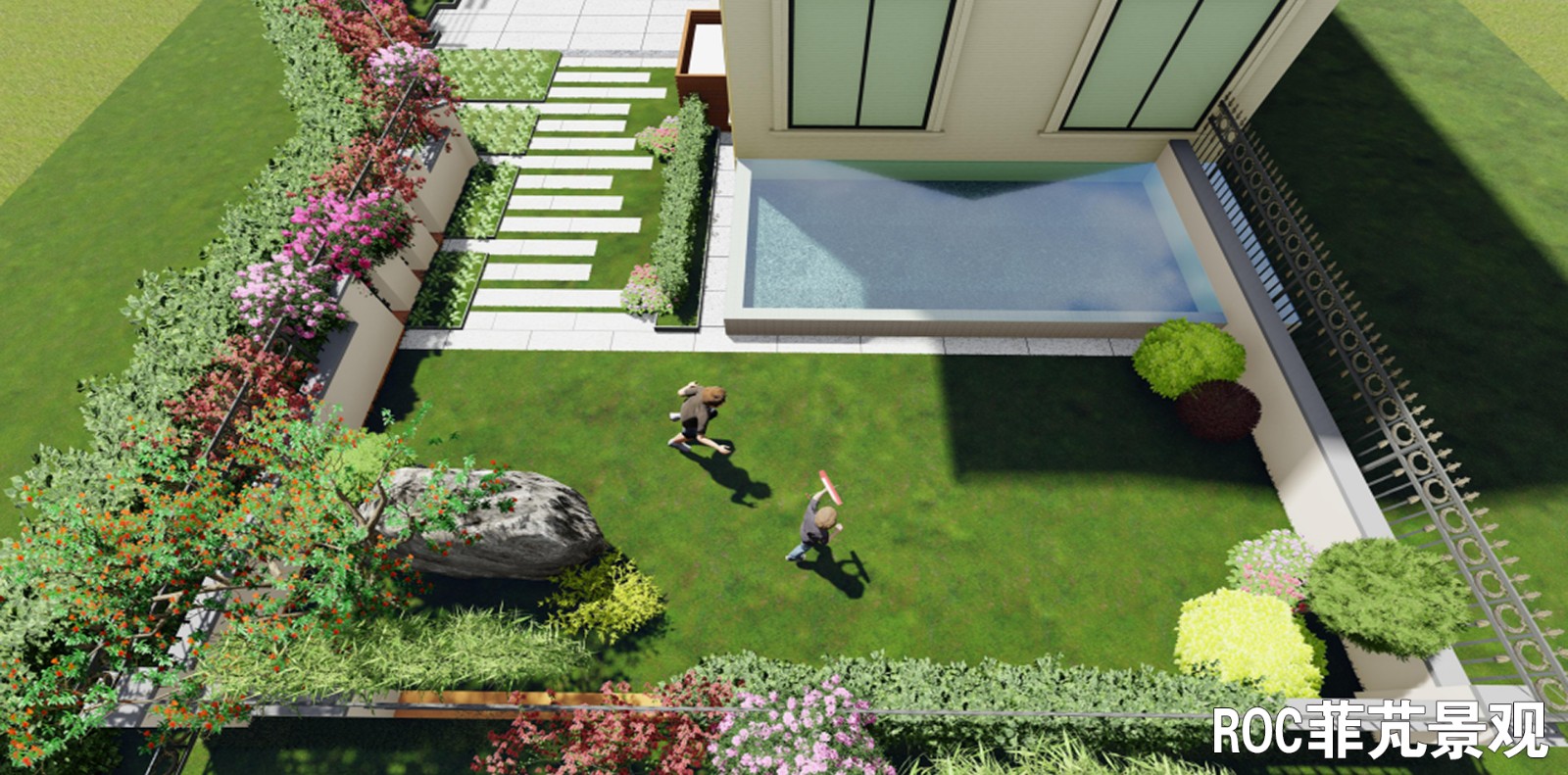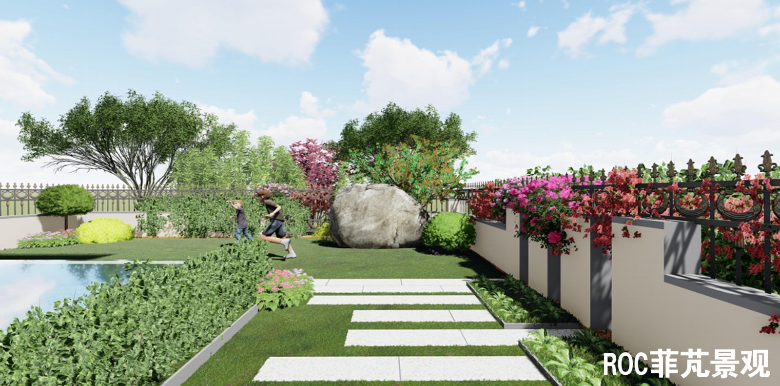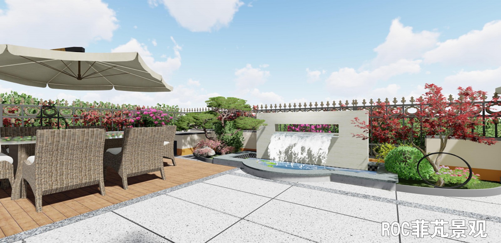 整个庭院以轴线设计,主要分为入口区、休闲区、生活区及儿童乐园。入口两侧分别栽种了柿子树和红枫,取意事事如意、鸿运当头。