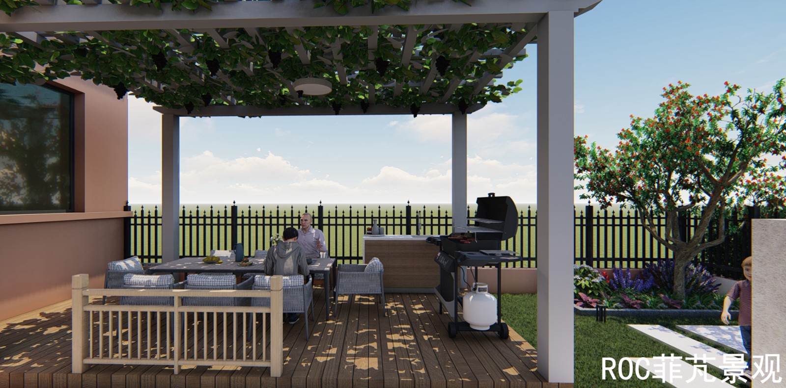 大体量廊架是本案的另一设计亮点。考虑业主有两株十余年之久的葡萄树,在廊架设计上加大体量,将视觉焦点转移至此,从而凸显葡萄树的年代感。