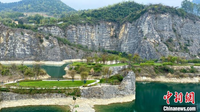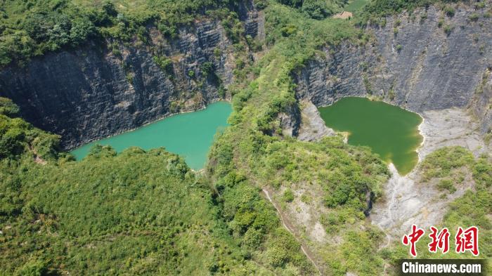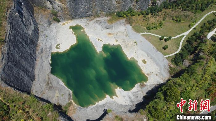 8月21日,夏日阳光下,位于重庆市渝北区的铜锣山矿山公园从空中俯瞰,矿区内部相互通联、水体清澈,公园集山水画卷、矿坑奇景、田园风光于一体。此前,铜锣山曾是西南地区重要的碎石供应基地,为保护环境,渝北区将矿山关停,陆续采取矿坑回填、表土覆盖、植物栽种、边坡整治等工程措施对矿坑进行生态修复,从而实现了从废弃矿山到绿水青山的美丽嬗变。图为崖壁之间环抱着碧绿的水体。