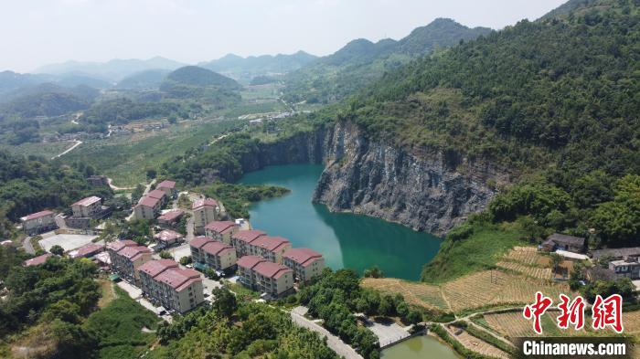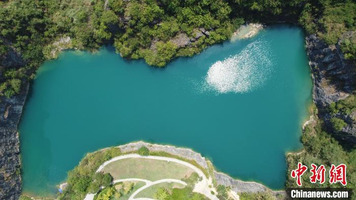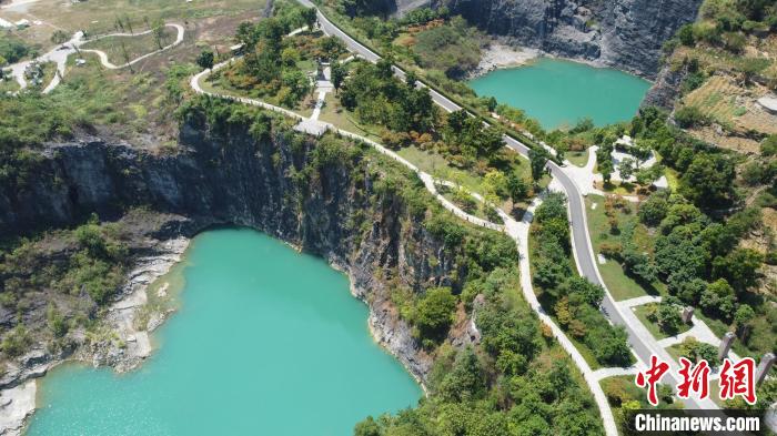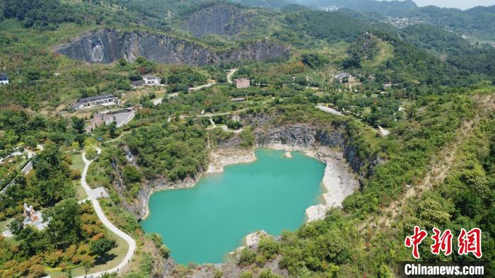 8月21日,夏日阳光下,位于重庆市渝北区的铜锣山矿山公园从空中俯瞰,矿区内部相互通联、水体清澈,公园集山水画卷、矿坑奇景、田园风光于一体。此前,铜锣山曾是西南地区重要的碎石供应基地,为保护环境,渝北区将矿山关停,陆续采取矿坑回填、表土覆盖、植物栽种、边坡整治等工程措施对矿坑进行生态修复,从而实现了从废弃矿山到绿水青山的美丽嬗变。图为矿坑俯瞰图,集山水画卷、矿坑奇景、田园风光于一体。